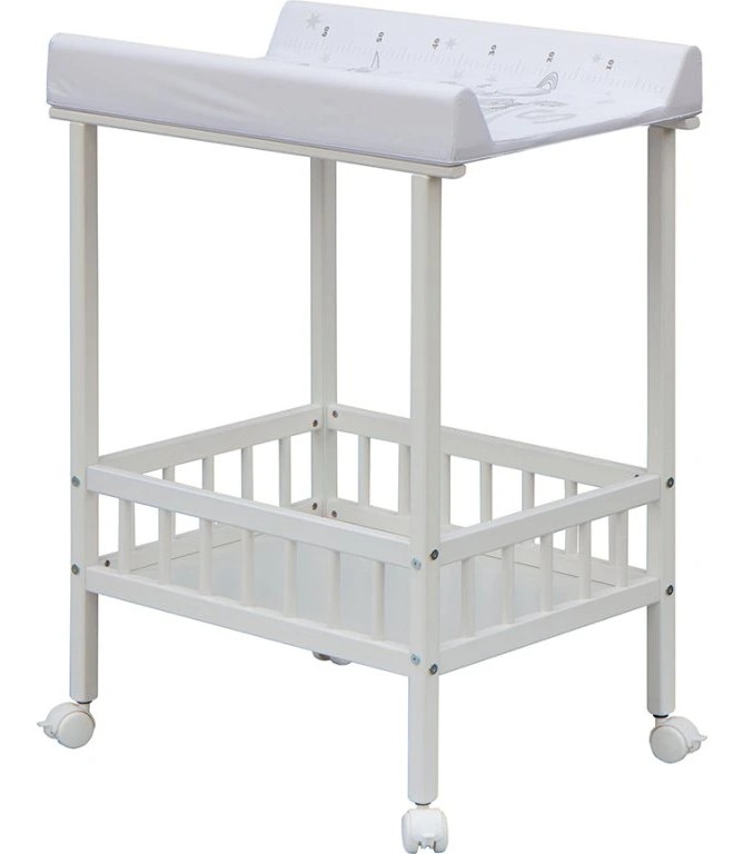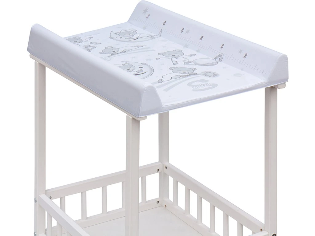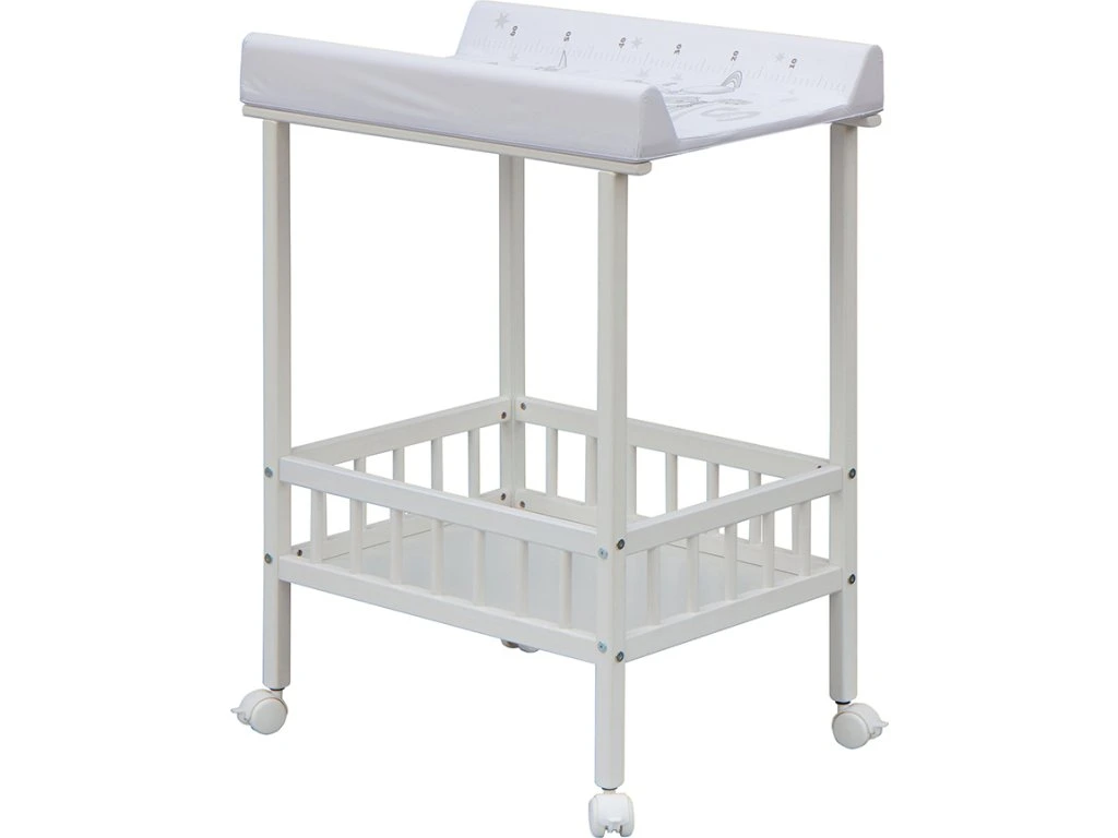 Prebaľovací pult Pája Scarlett s mäkkou prebaľovacou podložkou s vloženou pevnou doskou v bielej farbe, s policou na odkladanie vecí. Nohy pultu majú predvŕtane diere pre kolieska.